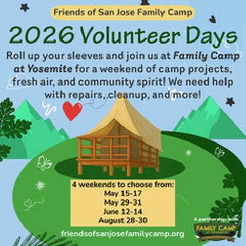 Welcome to the sign-up page for the 2026 Volunteer Days (formerly Work Parties). The Friends of San Jose Family Camp ("Friends") in partnership with the City of San Jose, has several exclusive weekend events outside of the normal summer season where the Friends helps with camp operations. For 2026, we will have 2 major project weekends and 2 group trip support weekends. The project weekends will have one pre-season and a second post-season. The group trip weekends are in support of Outdoor Equity campers that are visiting camp for a special hosted trip.